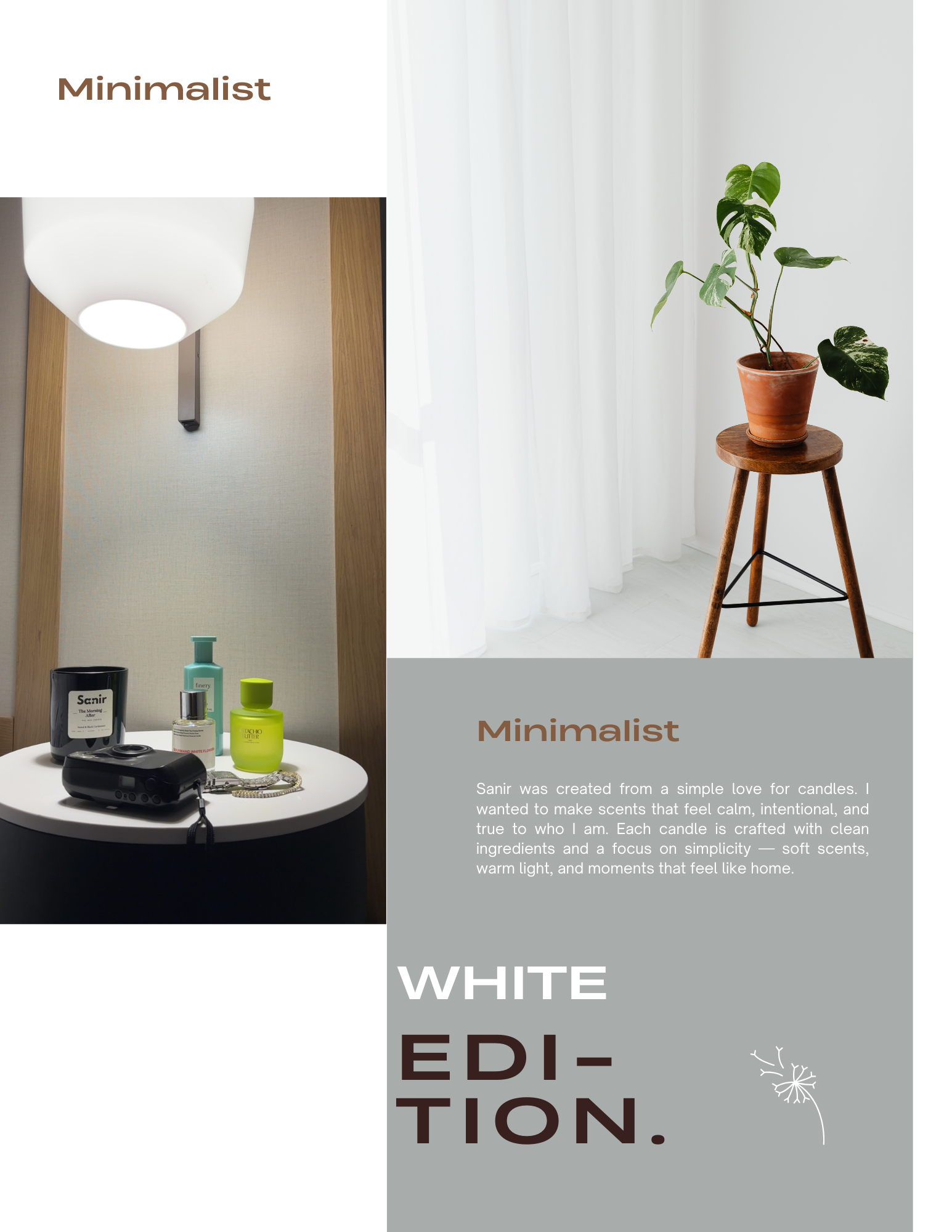 Sanir was created from a simple love for candles. I wanted to make scents that feel calm, intentional, and true to who I am. Each candle is crafted with clean ingredients and a focus on simplicity — soft scents, warm light, and moments that feel like home.